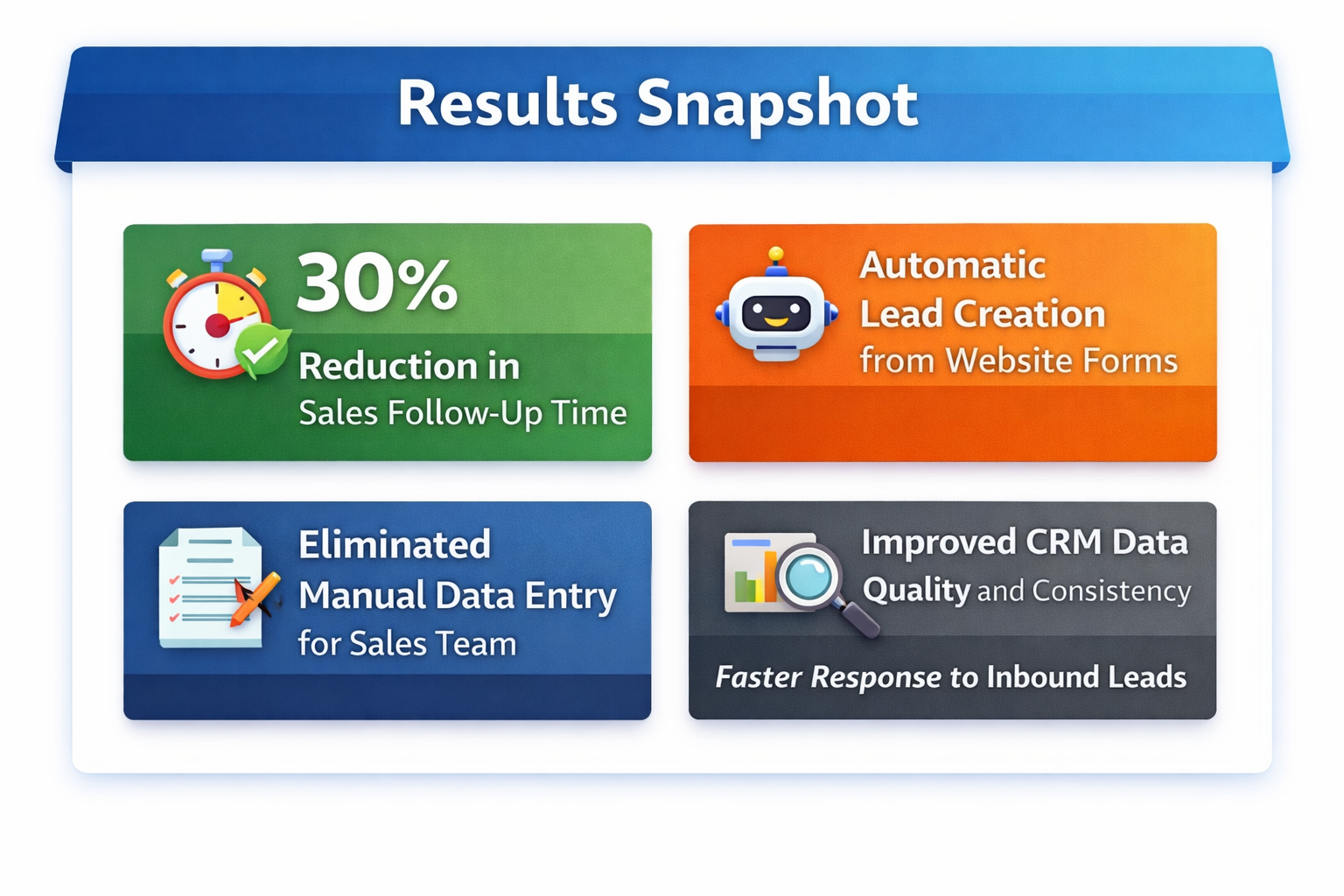The automation reduced sales follow-up time by 30%, as leads were instantly available and fully enriched in the CRM. Manual lead creation and data entry were almost completely eliminated, allowing the sales team to focus more on qualification and conversion rather than operations. The project significantly improved CRM data quality and sales efficiency.
