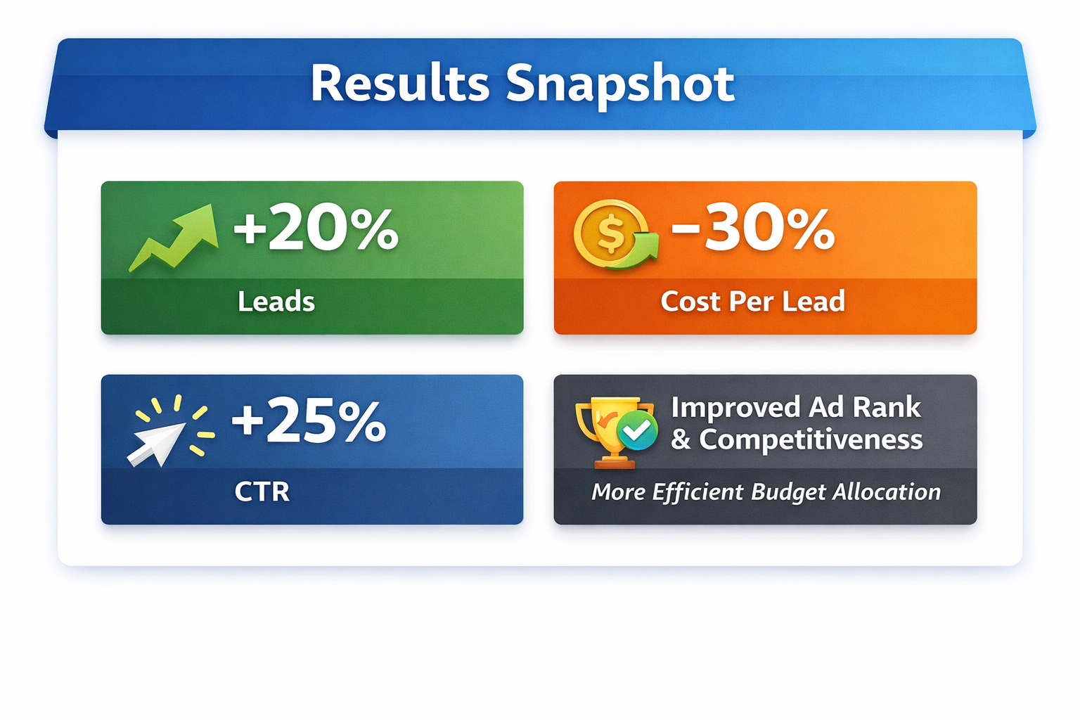 The optimization strategy led to a 20% increase in total leads, while cost per lead decreased by 30%. Improved keyword relevance and bidding strategies drove a 25% increase in click-through rate (CTR), strengthening ad rank and competitive positioning. Overall, the project delivered higher lead volume at a significantly lower acquisition cost.