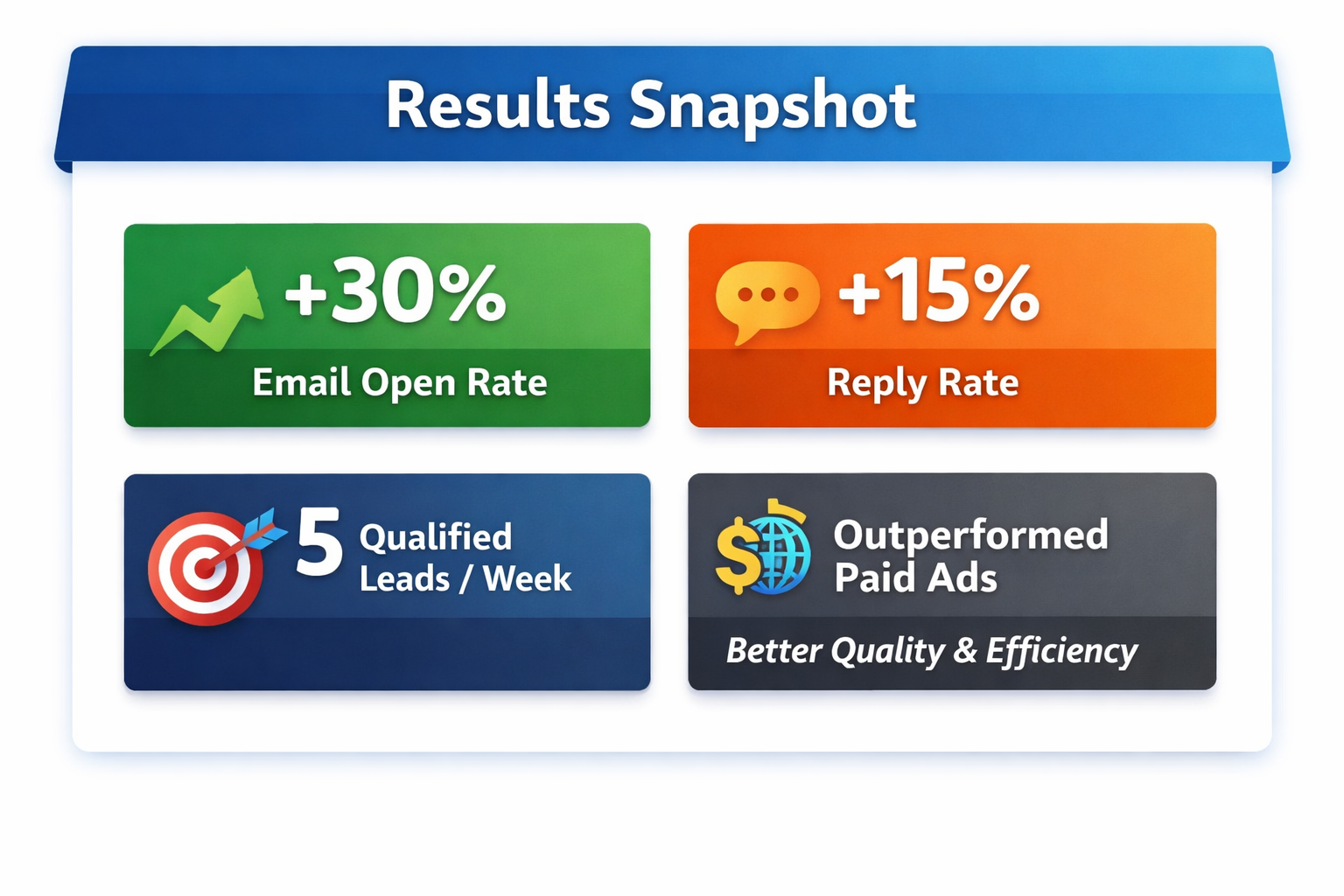 The outbound email strategy consistently generated an average of 5 qualified leads per week, outperforming parallel paid advertising campaigns in both lead quality and cost efficiency. Continuous testing improved email performance, with open rates increasing by 30% and reply rates improving by 15%. The project validated outbound email as a scalable and repeatable acquisition channel for highly technical B2B scientific products.